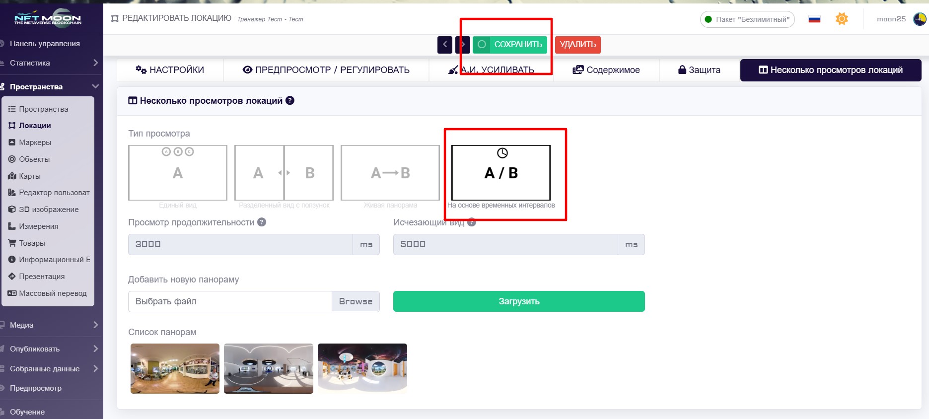 В разделе « Добавить новую панораму » вы можете загрузить разные версии одной и той же локации и переключаться между ними во время просмотра виртуального пространства.